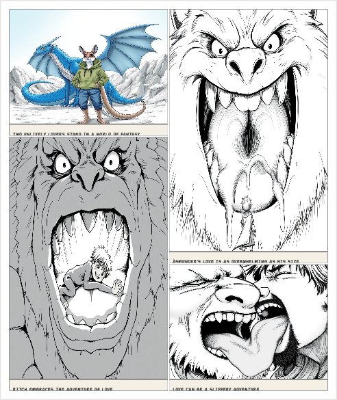Anthro kangaroo named Ritch and western blue dragon named Àsmundur are standing in front of each others. Ritch says to Àsmundur he loves him. Àsmundur part his jaws wide, with lots of slobber and drool connecting both jaws. Ritch crawl inside Àsmundur's maw. Ritch relax on the tongue, drool coats him. Àsmundur closes his jaws and swallow down Ritch. Àsmundur licks his lips. Ritch is inside the stomach, looking relaxed. Ritch says Is that your way of saying you love me?