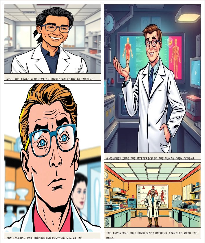 Criei uma historia Estilo Ghibli de um médico brasileiro de 42 anos, pele bege, cabelos rabo de cavalo preto na altura dos ombros, óculos de armação fina. Ela está usando um jaleco branco impecável sobre uma blusa azul marinho. Fundo de um laboratorio de fisiologia moderno. Iluminação suave de estúdio, 8k, realista., No quadro 1 ela se apresenta como o Doutor Isaac. No quadro 2 ela fala que vai ensinar sobre fisiologia. No quadro 3 ele diz que há 10 sistemas fisiologicos.