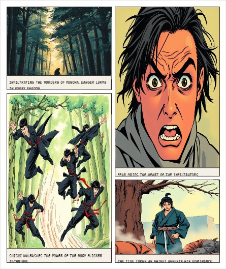 المشهد 1: هيبة الوميض (الافتتاحية) المكان: غابة كثيفة على حدود كونوها، وقت الفجر. الحدث: مجموعة من نينجا "الضباب" (أو نينجا هاربين) يحاولون التسلل. فجأة، يظهر ظل يتحرك بسرعة البرق. اللوحات (Panels): نينجا العدو يركضون، وفجأة يتوقف أحدهم برعب. لقطة مقربة (Close-up) لعين شيسوي وهي تتحول من الأسود للشارينغان الحمراء. شيسوي يتلاشى ويظهر في 5 أماكن في نفس الوقت (تقنية الوميض). العدو يسقط دون أن يلمسهم أحد، وشيسوي يقف بهدوء خلفهم وهو يغمد سيفه الصغير. الحوار: العدو: "مستحيل.. هل هذا هو.. وميض