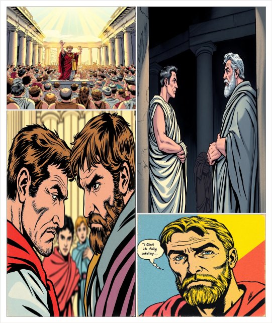 🟦 COMIC STRIP: REMEMBER CAESAR Panel 1 Caption: Rome celebrates Caesar’s victories. Citizen: “Caesar is loved by everyone!” Panel 2 Caption: Some senators feel uneasy. Senator: “He is becoming too powerful.” Panel 3 Caption: Cassius speaks to Brutus in private. Cassius: “Will you allow Caesar to rule Rome alone?” Panel 4 Caption: Brutus thinks deeply. Brutus (thought): “I love Caesar… but I love Rome more.” Panel 5 Caption: The conspirators meet secretly. Conspirator: “For Rome’s freedom, Caesa