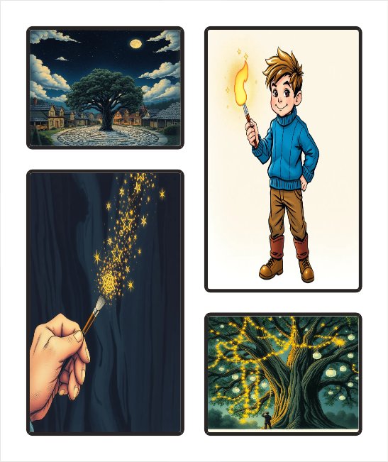 ans un petit village caché sous les nuages, un petit garçon nommé Léo possédait un secret : un pinceau magique qui pouvait peindre avec la lumière des étoiles. Un soir de décembre 2025, alors que la lune était voilée, il décida d'illuminer le vieux chêne de la place qui restait désespérément sombre. D’un geste vif, Léo dessina des guirlandes d’or et des lanternes d’argent directement dans l’air frais de la nuit. À chaque coup de pinceau, des étincelles se transformaient en véritables lampions