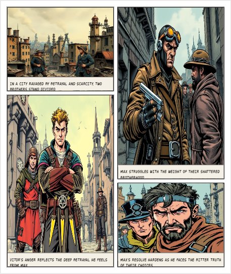 Titled "We used to be brothers". Featuring two black, cyborgs ,named Max and Vitor, who have resorted to attacking each other with futuristic weapons (A pistol and a set of glowing throwing knives. Set in a post-apocalyptic, steampunk city. Both Max and Vitor are talking about how they feel betrayed. Max says there's not enough water for all of us. Vitor says max has crossed the line by working with criminals and believing in prophets.