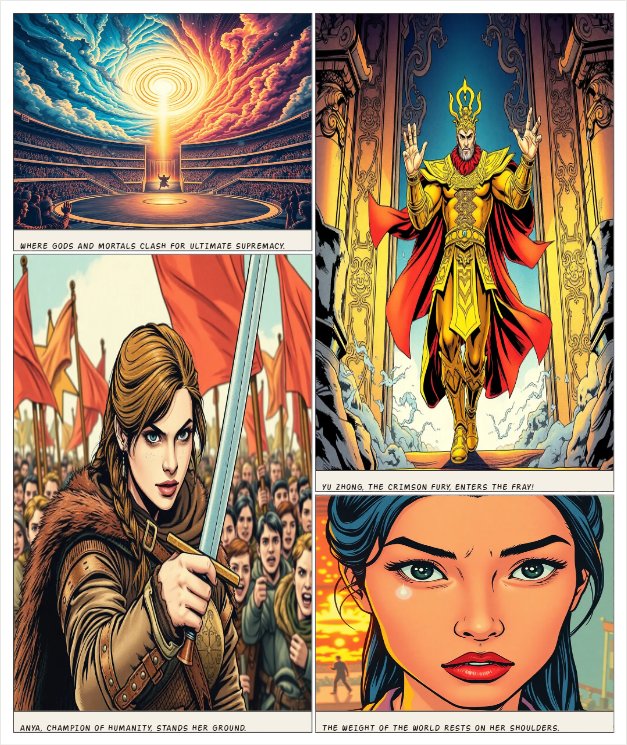 Panel 1 – Arena Ragnarok Langit terbelah. Arena raksasa dipenuhi sorakan dari dua sisi: para dewa dan umat manusia. Narator: “PERTARUNGAN AKBAR AKAN DIMULAI!!” “KITA SAMBUT… DARI GERBANG PARA DEWA!!!” “YU ZHONG!!!!”