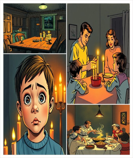 Una famiglia di 5 persone che mangia a lume di candele perché è andata via la corrente