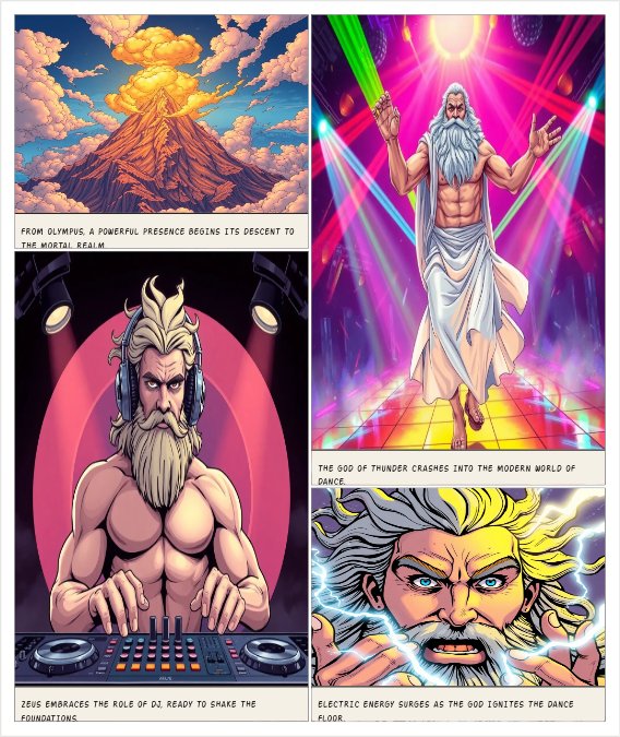 Zeus, il potente dio greco dell'Olimpo con barba bianca, fulmini in mano e toga classica, scende dal monte Olimpo su una nuvola dorata e entra in una discoteca moderna affollata. Sta dietro la console del DJ, con cuffie enormi sulle orecchie, mentre preme play su un mixer techno. Luci stroboscopiche colorate, laser, fumo, palla da discoteca che riflette fulmini, persone che ballano estasiate intorno a lui. Stile epico cinematografico, miscela tra mitologia greca antica e rave party techno moder