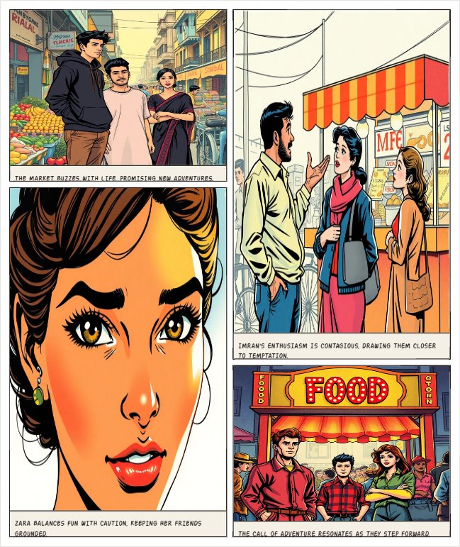 same characters throughout the comic: MG – Indian male, early 20s, lean athletic build, sharp jawline, short messy hair, intense eyes, small scar near eyebrow, wearing dark hoodie and jeans, calm serious expression Imran – Indian male, early 20s, slightly bulky, curly hair, expressive face, loud confident body language, wearing oversized t-shirt and track pants Zara – Indian female, early 20s, strong sharp eyes, long tied hair, simple kurti and jeans, calm confident presence, realistic beauty
