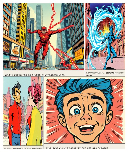 🟦 PÁGINA 1 Panel 1: Modern city, daytime. Tall buildings and streets. A red speed hero called Voltix runs between buildings leaving red lightning trails. Speech bubble: “¡Nada como correr para despejar la mente!” Panel 2: A blue energy vortex appears suddenly in the street. A blue speed creature named Azur jumps out, surrounded by wind and energy. Speech bubble: “¡Hey! ¿Este mundo es nuevo o viajé demasiado rápido?” Panel 3: Voltix stops suddenly, looking surprised at Azur. Speech bubble: “¿