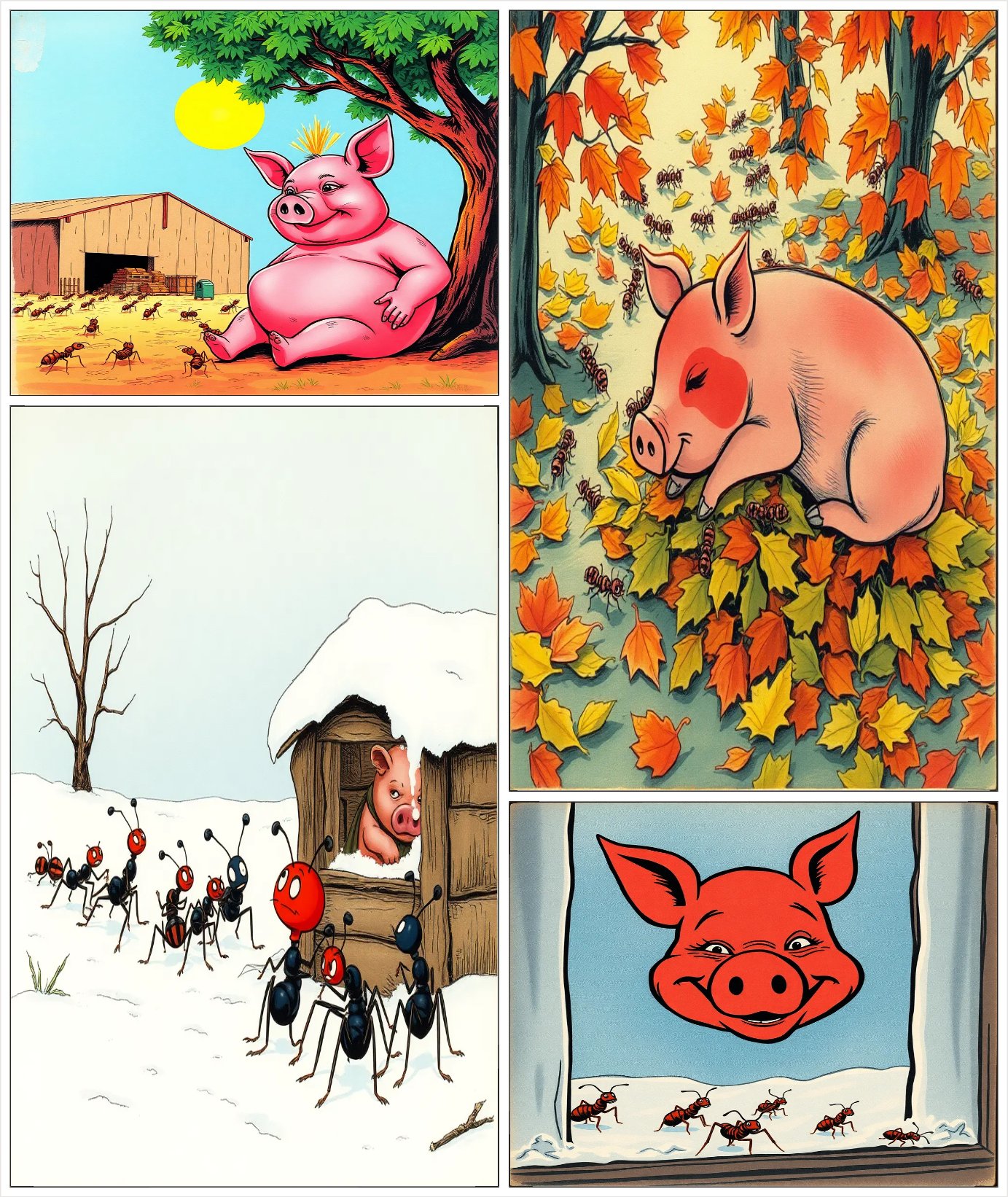 **배경**: 2025년 붉은 말의 해, 눈 내리는 겨울 **등장인물**: - 빨간 돼지: 얼굴이 동그랗고 항상 빨갛고 열이 많아 대머리에서 아지랑이 2개가 올라오는 돼지. 게으르고 남을 비웃기 좋아함 - 부지런한 개미: 여름부터 겨울을 준비해온 성실한 일꾼 ### 📝 4컷 만화 스토리 **1컷 - 여름 (회상)** - 뜨거운 여름날, 개미들이 창고에 열심히 식량을 나르고 있음 - 빨간 돼지가 그늘에서 쉬며 개미를 보고 웃음 - 돼지: "크크크, 이 더운 날에 뭘 그렇게 열심히 해? 놀아야지!" - 대머리에서 열기로 아지랑이 2개가 피어오름 **2컷 - 가을 (회상)** - 개미들이 여전히 부지런히 일함 - 빨간 돼지는 낙엽 위에서 낮잠 - 돼지: "아직도 일해? 시간 많은데 나중에 해도 되는데~" **3컷 - 겨울 (현재)**
