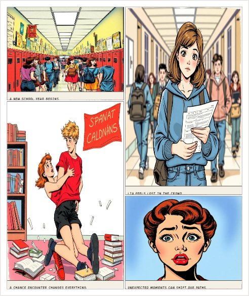 PAGE 1 – First Day Panel 1: A crowded high school hallway. Narration: “A new school year begins.” Panel 2: Lia, holding her schedule, looks lost. Lia (thinking): “Room 203… or 302?” Panel 3: She bumps into Ethan, books falling. Ethan: “Whoa—sorry!”