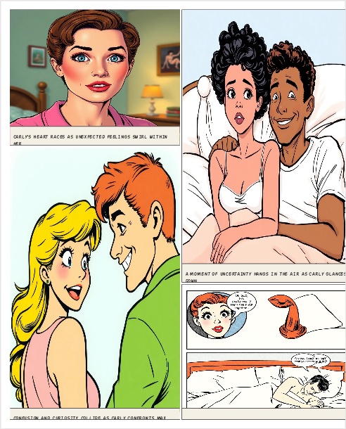 Okay next page: First panel of row one: A zoom in on Carly’s face as she blushes hard, her eyes wide with surprise, and anticipation. Give her a thought bubble that says “Oh my God, is this really happening? Ugh, pull yourself together!” Next panel: a zoom out back to the both of them in bed with Carly looking slightly confused as she looks down at the bottom of the bed. First panel of row two: is Carly saying “Are you.. touching my l-leg?” With a blush towards max who’s grinning slightly