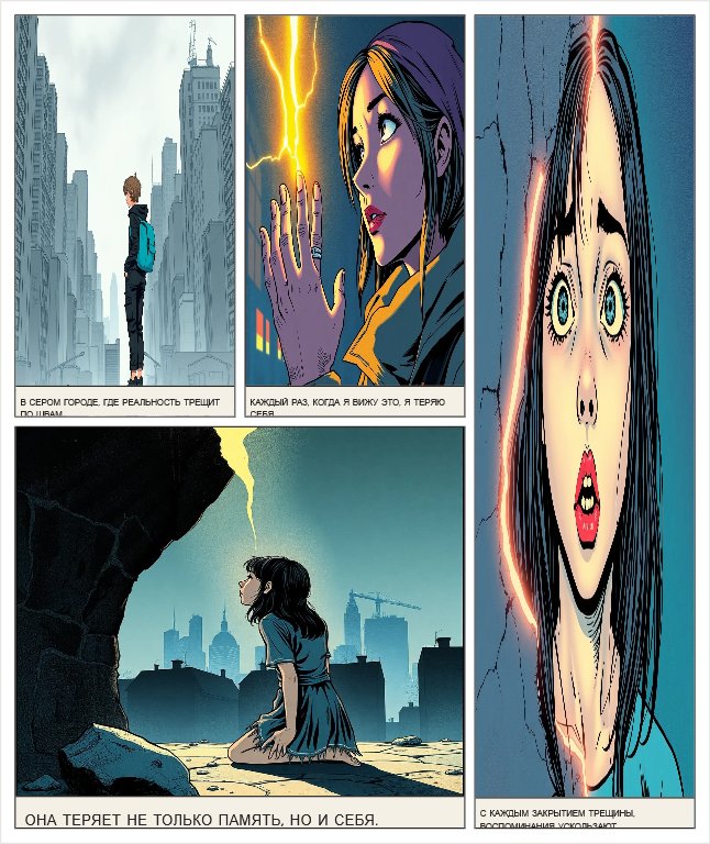 A comic strip in the genre of science fiction and mystery drama. The near future, a cold, minimalist city. A 19-year—old courier girl sees "seams of reality" - luminous cracks in space that others do not notice. When the cracks close, she loses her memories. The atmosphere is melancholic, disturbing, philosophical. Style: minimalism, thin nervous lines, distorted perspective, broken grid of frames. Colors: gray and cool shades, bright neon accents on the cracks. Slow pace, minimal text, visual