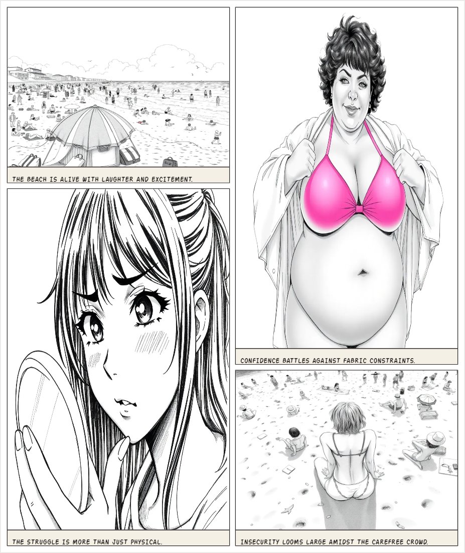 a big chubby woman struggling to fit into her bikini, as she changes at the beach.