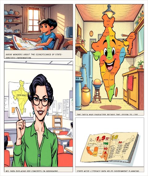 41. GEOGRAPHICAL CLASSIFICATION – COMIC ANIMATION Comic Panels (3–4 panels) Panel 1: Aarav holding a newspaper 💬 Aarav: “Why do newspapers show state-wise data?” Panel 2: India Map character appears 💬 India Map: “Because data changes from place to place!” Panel 3: Ms. Data pointing at states 💬 Ms. Data: “This is called geographical classification.” Panel 4 (Flip Panel): Lift flap → literacy rates appear on states 💬 Caption: State-wise literacy data helps government planning.