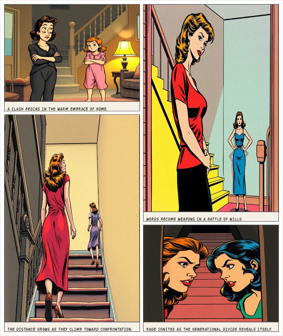 una madre (sara) de 35 años en pijama negra de cuerpo completo, un cuerpo adulto bien desarrollado y cuidado, descalza y sin ropa interior y su hija (nicole) de 12 años, con un cuerpo medianamente desarrollado con un pijama rosa descalza, se encuentran peleando por la forma de ser de la otra. mientras va escalando el conflicto, la niña se va alejando de la madre y se dirige a las escaleras mientras que su madre va detrás de ella, al llegar a la planta de arriba las dos se miran con una rabia con