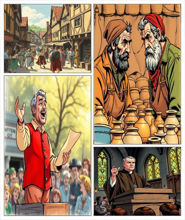 🟦 Case 1 — Moyen Âge : la rumeur fait l’info Décor : une place médiévale (marché, stands, maisons à colombages). Personnages : deux marchands, un crieur public, un prêtre. Bulles : Marchand 1 : « Tu as entendu ? Il paraît que… » Marchand 2 : « Oui, tout le monde le dit ! » Crieur public : « Oyez, oyez ! Message du seigneur ! » Prêtre (en chaire) : « Gardez‑vous des mauvais propos ! » Texte sous la case : Opinion = avis partagé. Public = ce qui est commun. Pas encore d’“opinion publique”,
