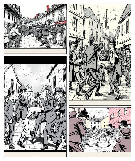 black and white cartoon drawing of gentile men kicking hassidic jews in a town square