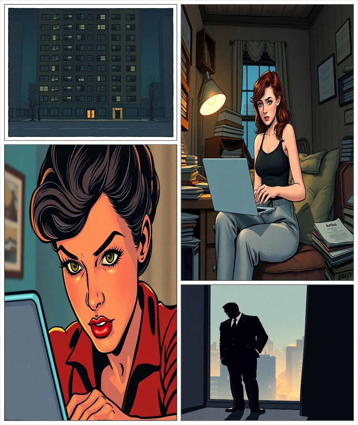 Scene 1: Wide static cinematic shot of an apartment building facade at night. The street is quiet...