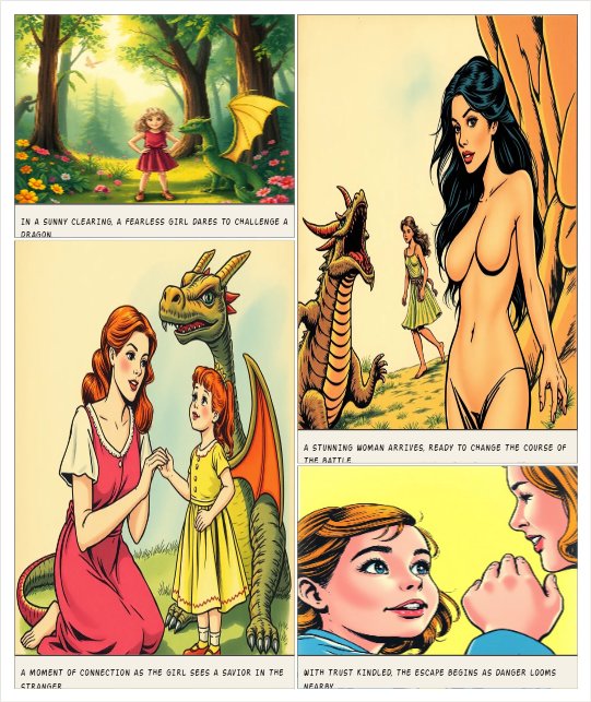 A naked and beautiful woman finds a little naked girl fighting with a dragon and help her to scape. After that they sleep together very tired showing their bottock