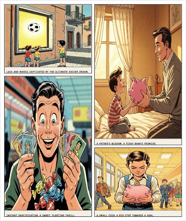 Pagina di fumetto educativo per bambini 8–10 anni. Luca e Marco guardano un pallone in una vetrina. Il prezzo è alto. A casa, il papà di Luca gli dice che può mettere da parte un po’ alla volta e gli regala un salvadanaio porcellino. Marco compra caramelle e figurine ed è felice per poco. A scuola, Luca conserva una moneta per il salvadanaio. Marco ha le tasche vuote ed è frustrato. Stile semplice, colori caldi, educativo.