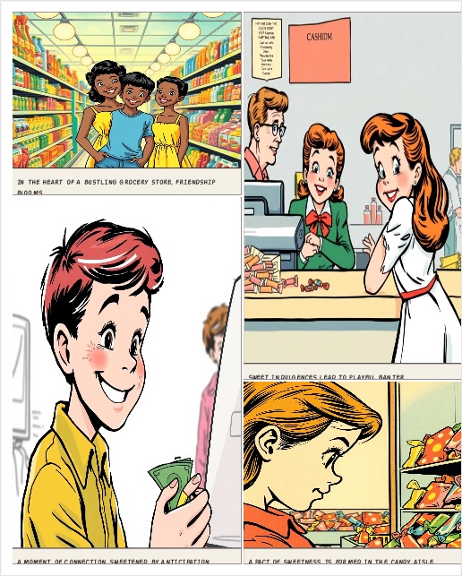Девушка и парень стоят внутри продуктового магазина и болтают, он покупает ей сладости на кассе. Девушка смуглой кожи с длинными черными волосами а парень со светлой кожей , черными волосами и небольшой бородой на лице, у него короткая стрижка и они одного роста