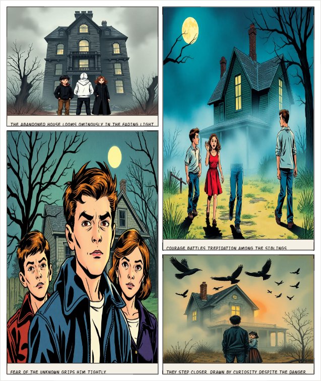 cene 1 — Outside the Abandoned House Prompt: Three siblings (two teenage boys, one teenage girl) stand before an old abandoned house at dusk, overgrown weeds, broken windows, thick fog at ground level, dark sketch style, high contrast, dramatic shadows, camera low angle, atmosphere of mystery and danger, the house looks larger than it should, black crows on the roof, cold blue moonlight mixed with orange sunset reflections, detailed clothing: black jacket boy1, white hoodie boy2, long black coa