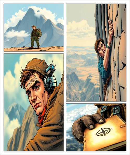 Personaje: Un pequeño robot o un explorador en un paisaje vasto. Viñeta 1: Imagen: El personaje está en la base de una montaña altísima cuya cima se pierde entre las nubes. Se le ve pequeño, ajustándose una mochila o sus herramientas. Texto (Pensamiento): "Dijeron que era un viaje imposible." Viñeta 2: Imagen: El personaje está a mitad de la montaña, escalando con esfuerzo. Se ve sudor o señales de cansancio, pero su mirada está fija hacia arriba. El paisaje abajo se ve ya muy lejano. Texto (Pen