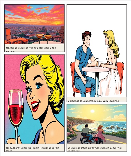 Un chico alto moreno y una chica mas bajita y rubia se toman un espresso martini en una terraza de Barcelona, España con un atardecer increíble y luego al dia siguiente van en moto por la costa brava y luego están dos meses hablando por teléfono él en indonesia y la chica en madrid por ultimo se reencuentran en barcelona