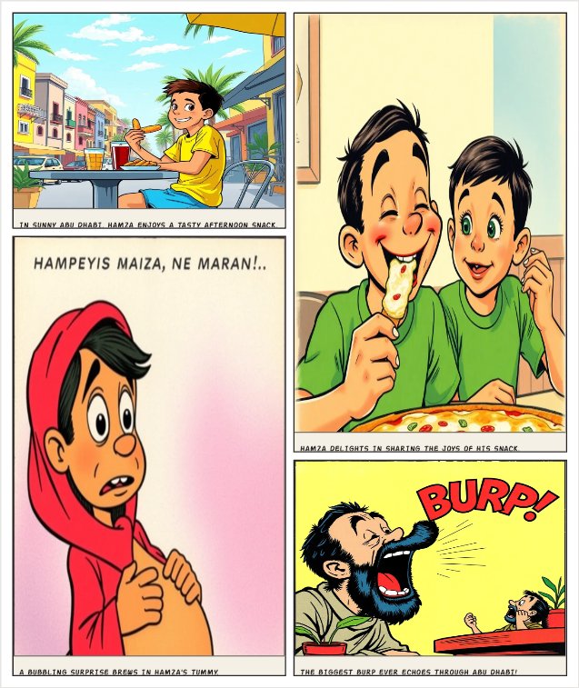 Hamza and the Great Big Burp of Abu Dhabi Once upon a time, in the sunny city of Abu Dhabi, there lived a boy named Hamza and his twin brother. One afternoon, Hamza sat at the table eating crunchy mozzarella sticks and drinking fizzy soda, while his twin brother watched. Hamza munched and sipped happily, one bite after another. Suddenly, Hamza felt something bubbling in his tummy. “Uh-oh,” he said. Before he could cover his mouth—BUUUURRRRP! It was the biggest burp ever. The floor shook.