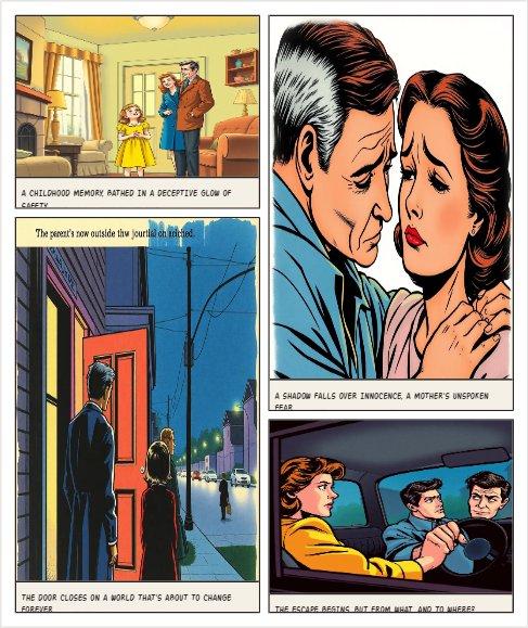 Panel 1 Scene: A cozy living room, warm lighting. ANNA (F, 6, White), in a bright yellow dress, looks up at her MOTHER (F, 30s, White) and FATHER (M, 30s, White). The Mother wears a blue coat, the Father a brown jacket. Speech: "Hey Mom, what is it, dear? Where are you going with Daddy?" Caption: A childhood memory, bathed in a deceptive glow of safety. Panel 2 Scene: Close-up on the Mother's face, strained and sad. The Father's arm is around her, a silent comfort. Soft, diffused light