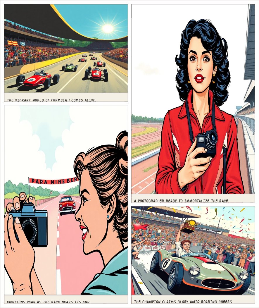 Una mujer tomando fotografias de un gran premio de formula 1 y celebrando la victoria