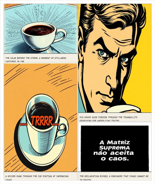 Extreme close-up, B&W manga, a Extreme close-up, B&W manga, a ceramic coffee cup on a glass table, concentric ripples in the dark liquid, sharp reflections of a cold ceiling light, high contrast ink hatching. Subtle vibration lines around the cup, onomatopoeia "...TRRR..." in small, shaky Japanese-style katakana font. Solid black rectangular box, white bold typography, minimalist manga style. "A Matriz Suprema não aceita o caos." style, B&W, 30-year-old man, sharp eyes, calm and neutral facial