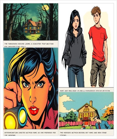 Create a comic on the yami, ben and the horror escape from tamashaka bosche. It is that they escape and rescue childrens of their school who are trapped in a horror house by some wicked people when they were in picnic