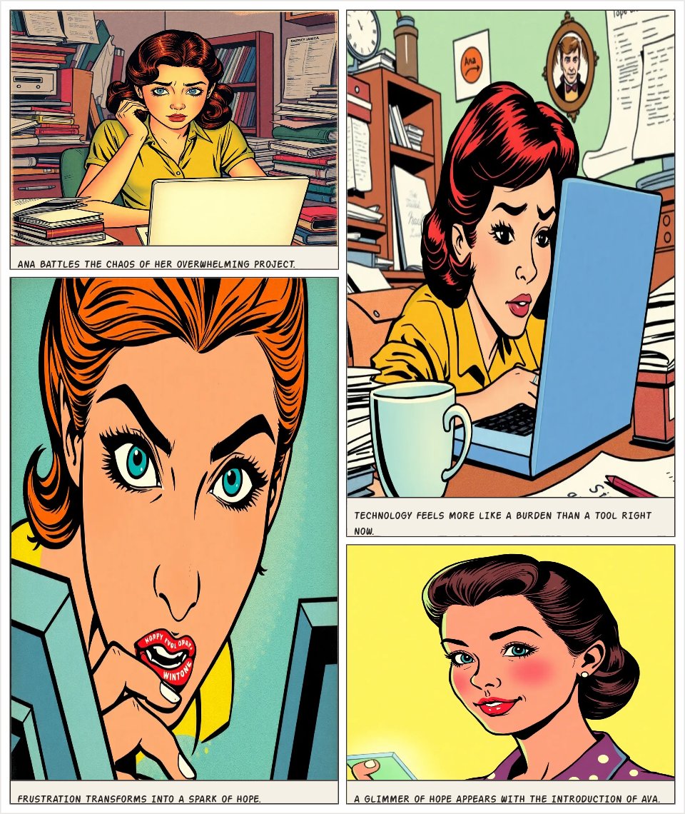 Una Historieta Contexto: Para la fase 5 (Diseño y Prototipado), para ilustrar la transformación del aprendizaje con la IA. Título: "El Proyecto Eureka: De la Monotonía a la Creatividad Asistida" Personajes: Ana: Estudiante frustrada con un trabajo de investigación. Profesor Martín: Guía de Ana, entusiasta de la IA. AVA (Asistente Virtual de Aprendizaje): Una interfaz de IA. Viñeta 1: Imagen: Ana sentada frente a su laptop, con montañas de libros y papeles a su alrededor,