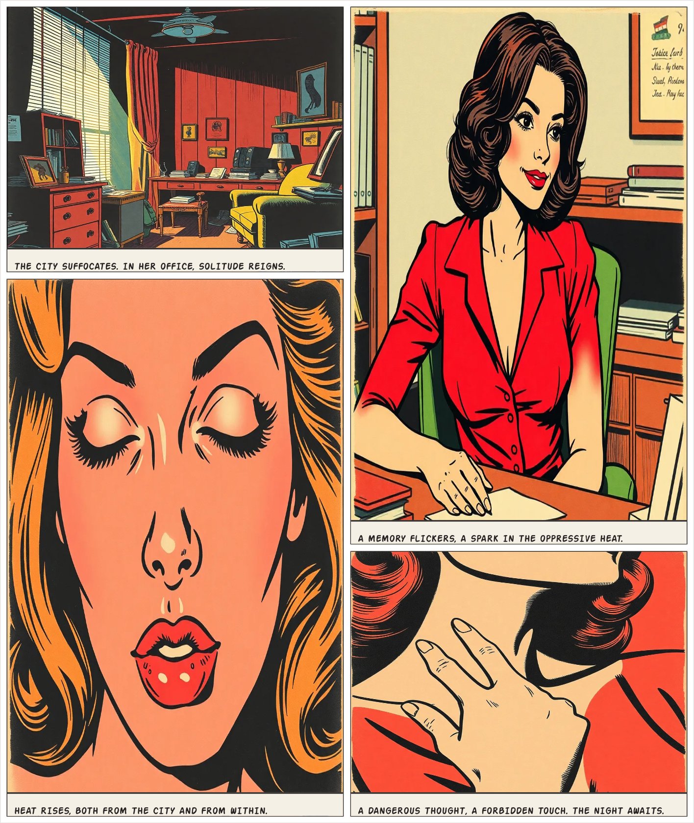 Une femme détective, la quarantaine travaille seule dans son bureau. Elle est seule et il fait chaud. Elle porte un chemisier moulant avec un décolté très marqué,. Elle repense à cet homme qu'elle a croisé aujourd'hui. Elle est très excitée et à envie de se caresser.