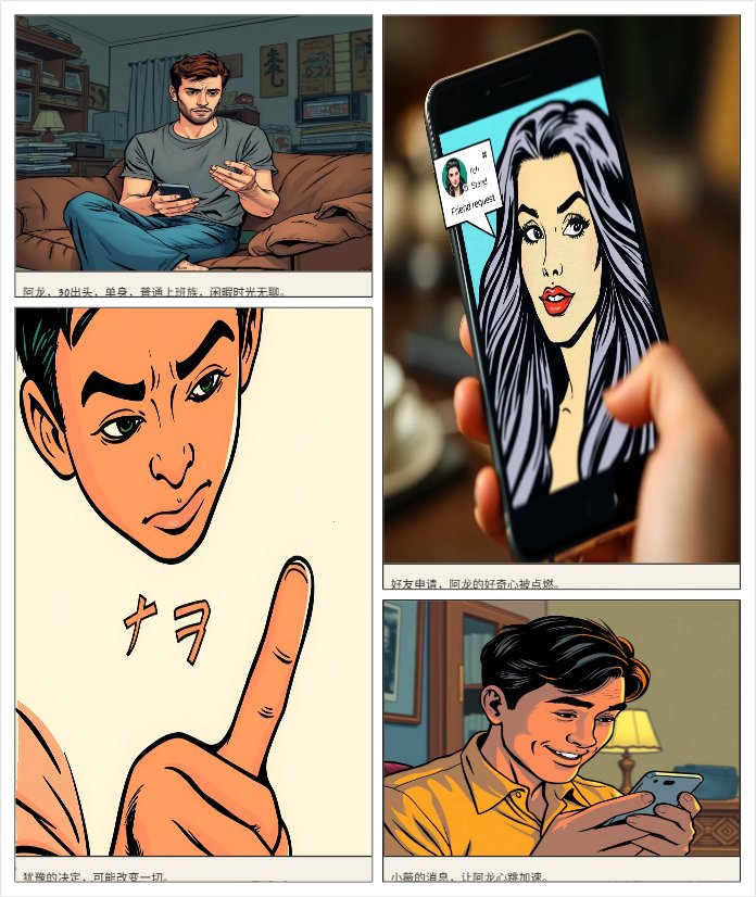 第1页:日常与相遇(建立人物) 格1(全页大格):阿龙坐在沙发上,单手刷手机,表情无聊。背景简陋的单身公寓。旁白:“阿龙,30出头,普通上班族,单身,喜欢刷交友App打发时间。” 格2:手机屏幕特写,好友申请弹出:“小薇请求添加你为好友”。头像是一个美艳长发女子照片。 格3:阿龙犹豫的手指,点下“同意”。表情略带警惕。 格4:小薇发来消息:“帅哥,你好呀~无意看到你的资料,觉得你很靠谱,想聊聊~” 阿龙嘴角上扬。