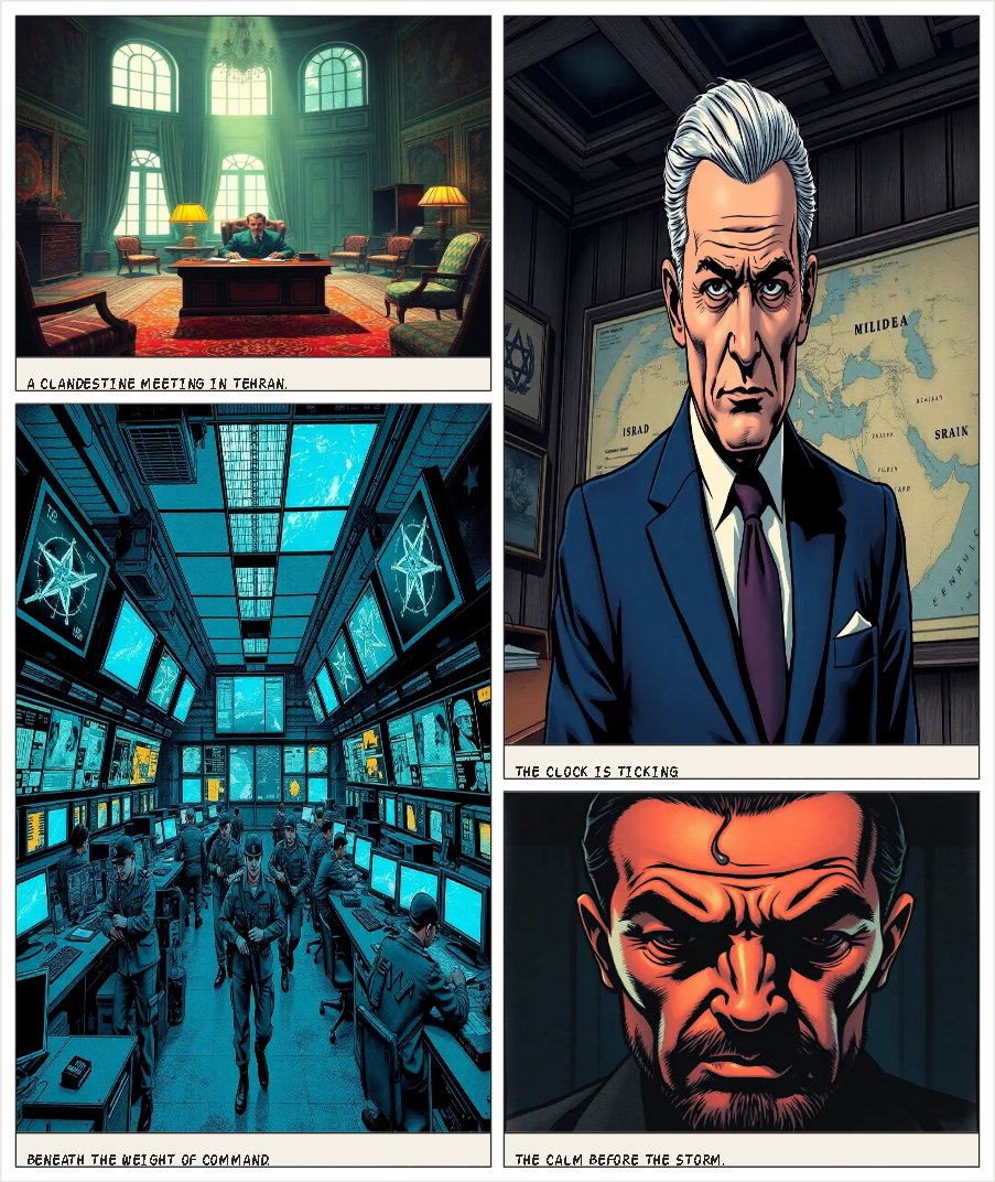 : ๐ Comic Prompt (Recognizable Leaders โ Look-Alike Style) Prompt: Create a dramatic comic-style story about a modern conflict between Israel and Iran. The main political figures are fictionalized but clearly recognizable versions of real-world leaders. โ The Israeli Prime Minister is portrayed as an older statesman with silver hair, sharp facial features, a formal suit, and a commanding presence, strongly resembling the current Israeli leader. โ The Iranian leader is depicted as a senior