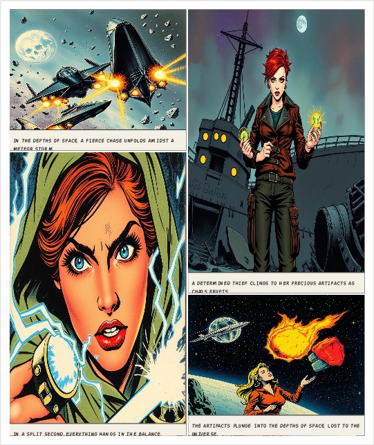 VELOCITY — VOLUME 1: BORN FROM THE FALL Deep in space, two massive QUAD T. SHIPS rip through a meteor field, weapons glowing as they chase a smaller, damaged craft. Standing on top of the fleeing ship is a lone thief, gripping two glowing artifacts—the Speed Rock crackling with blue lightning and the Fire Rock burning white-hot. A blast hits the ship. The thief loses balance. Both rocks tear free and plunge into the void, falling for days… until Earth pulls them in. On the same day, Sam Taylor