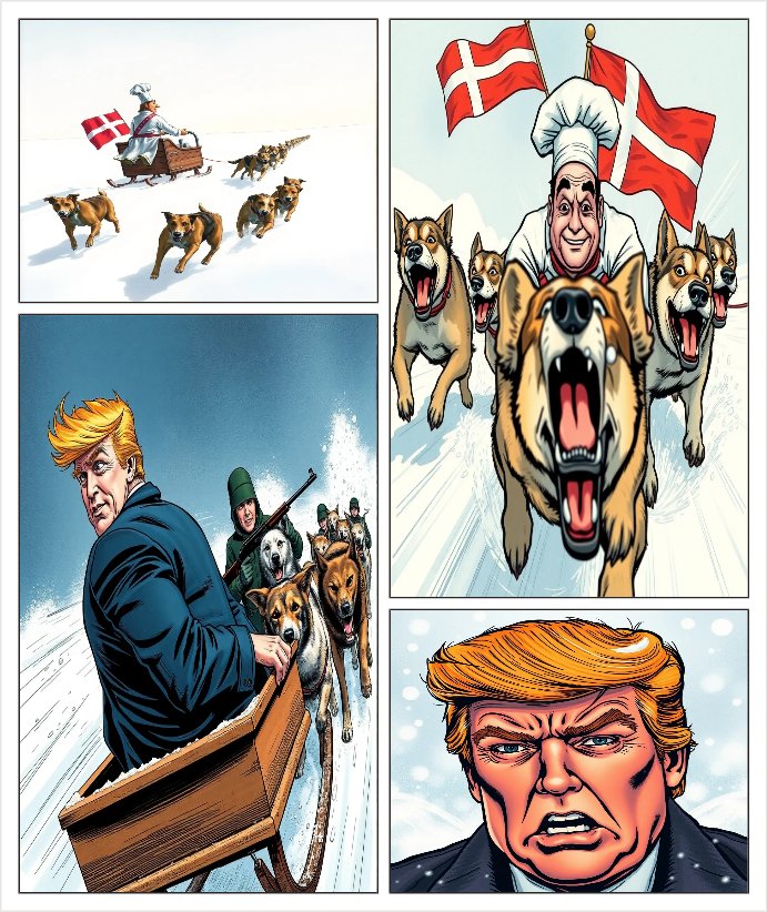 Trump is fleeing from a dog squad. Panic and fear are clearly visible, even among the soldiers accompanying him. A Danish flag is clearly visible on the sled. The sled is being driven by the Swedish chef from The Muppet Show.