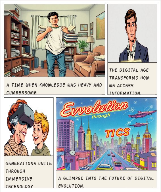 A 4-panel comic strip about the digital era evolution. Panel 1: A person in the 90s struggling with many heavy physical books and paper maps. Panel 2: The same person today holding a thin glowing tablet with a world map and digital icons. Panel 3: A grandmother and a grandson sharing a VR headset together. Panel 4: A futuristic city with digital connections in the air and a sign that says 'Evolution through TICs'. Colorful comic book style, clean lines.