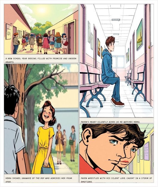 Story Prompt: Paven & Hema In 2022, at a quiet high school, a 14-year-old boy named Paven notices a girl named Hema on her very first day. She is 13. From that moment, his world slowly begins to revolve around her. He never approaches her. Never confesses. He believes loving her silently—seeing her every day—is enough. Time passes. Hema gets into a relationship with another boy. Paven stays the same—smiling outside, breaking inside. His love remains one-sided, untouched, unspoken. One day, Paven