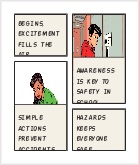 Crea un fumetto educativo ambientato nella vita quotidiana di alcuni studenti delle scuole superiori. Ogni vignetta rappresenta un ambiente diverso: scuola, casa, strada e luogo di lavoro/stage. In ogni ambiente mostra una situazione di rischio realistico ma non violenta (es. pavimento bagnato, presa elettrica danneggiata, zaino lasciato a terra, uso scorretto di attrezzi). I personaggi individuano il pericolo, spiegano perché è un rischio, quali comportamenti corretti adottare e quali semplici