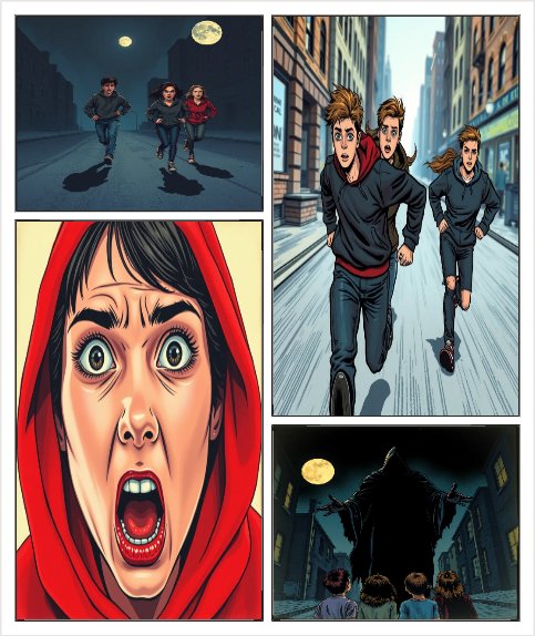 In the dark night, the faint moonlight cast its glow on the deserted street. The sound of dogs barking echoed from somewhere in the distance. Suddenly, four figures emerged from the street, running frantically and looking around nervously. Their faces were drenched in sweat, and their eyes were wide with terror. They were all visibly frightened. "Don't look back... just run!" one of the boys gasped. But then a terrifying scream pierced the air from behind them. "He... he's coming after us!" a gi
