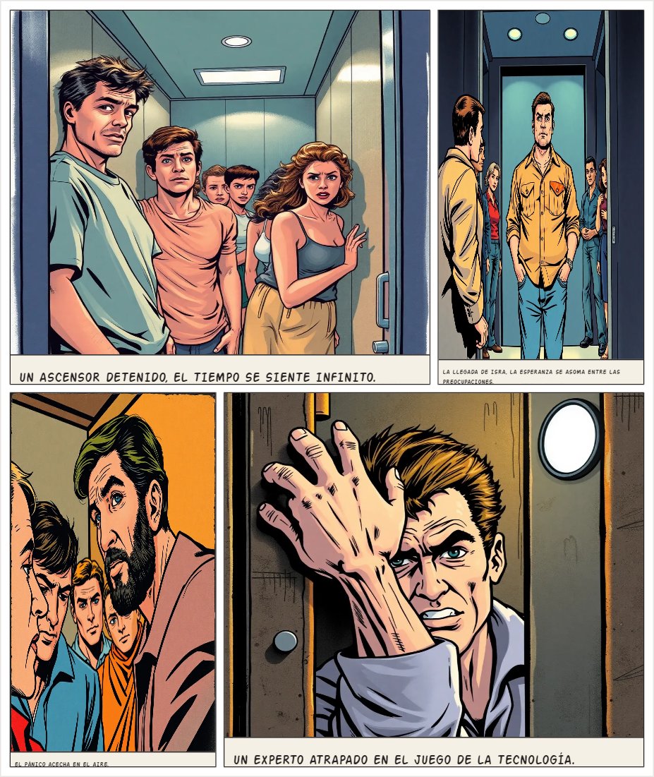 ISRA: EL ASCENSOR SUBE, ÉL NO SIEMPRE PÁGINA 1 Viñeta 1 Ascensor parado. Gente sudando, uno con cara de resaca. Vecino: “Llevamos 20 minutos aquí.” Vecina: “Y yo 10 sin fumar.” Viñeta 2 Entra Isra, serio, ojeras leves, barriga cervecera orgullosa. Isra: “Buenas… ¿alguien ha pulsado todos los botones, verdad?” Viñeta 3 Todos mirando al suelo. Isra: “Lo sabía.” PÁGINA 2 Viñeta 1 Isra con medio cuerpo dentro del panel del ascensor. Texto: Diez años arreglando máquinas… y todavía no a personas.