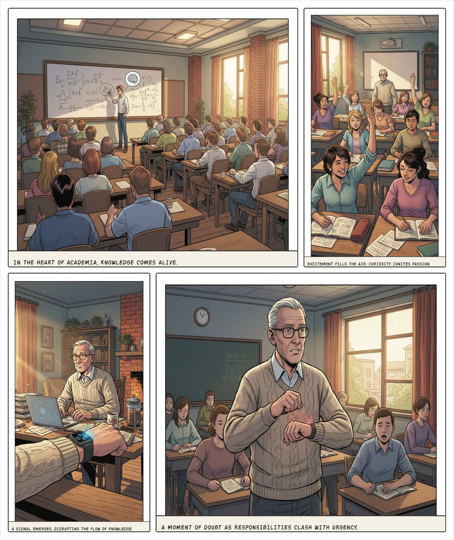 Panel 1: bright university lecture hall, Oscar in shirt at a whiteboard drawing a physics formula, students watching. Panel 2: students smiling, taking notes. Panel 3: close-up on Oscar's wrist with a discreet smartwatch or device starting to blink. Panel 4: Oscar glances at the device, slightly worried, classroom in the background. Panel 5: later in a locker room or office corner, he removes his jacket and we can see a hint of the glowing superhero suit under his shirt.