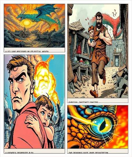 Epic fantasy comic scene. A destroyed medieval fantasy village inspired by the game Dofus. Buildi...