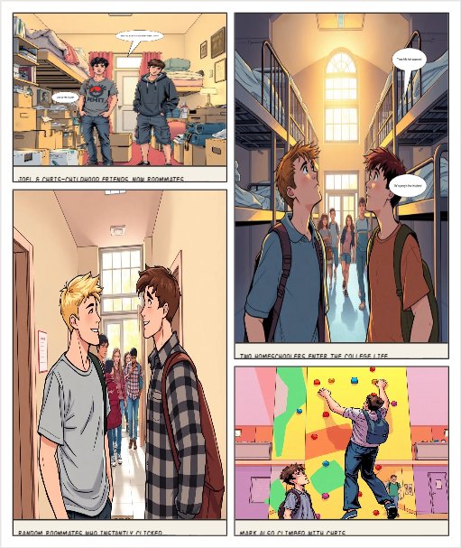 Panel 1 Room 411. Joel and Chris beside loft beds, boxes everywhere. Caption: Joel & Chris—childhood friends, now roommates. Panel 2 Joel and Chris look up at the lofts, excited. Caption: Two homeschoolers enter the college life. Panel 3 Room 409. Mark(white, blond hair) and Alex(white brown hair) casually greet each other. Caption: Random roommates who instantly clicked. Panel 4 Climbing wall. Mark climbs, Chris spots below. Caption: Mark also climbed with Chris.