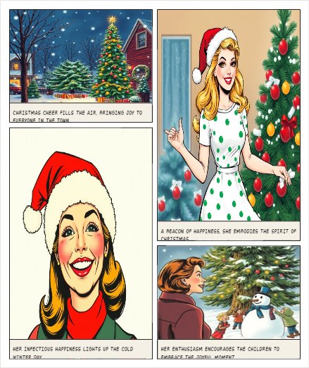 une femme blonde souriante en robe blanche à petits pois verts style publicité groupama, porte un chapeau de Noël avec un phylactère "c'est la trêve générale" . En fond un sapin de Noël
