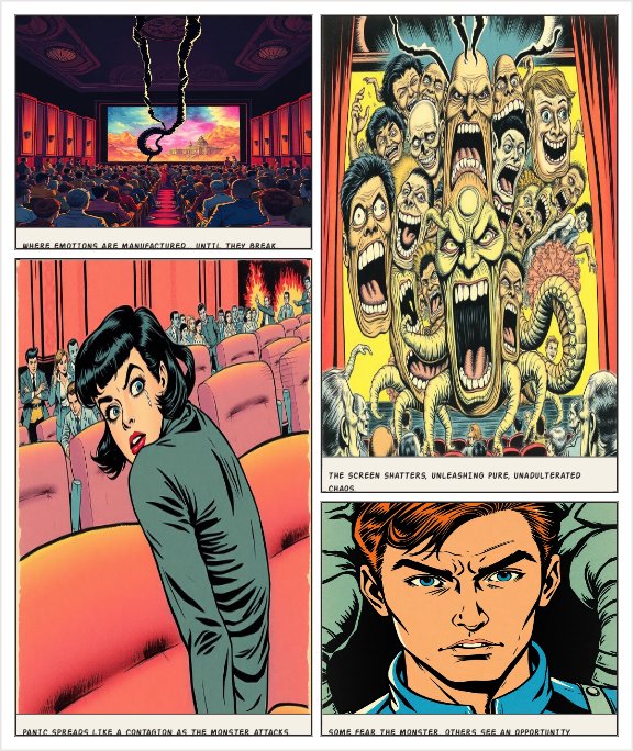 # BRAVE NEW WORLD: THE FEEL-POCALYPSE ## A 4x2 Comic Script ----- **PANEL 1:** *The Feelies theater, packed with citizens. On screen, a romantic scene plays. Suddenly, the screen CRACKS and a giant tentacle pushes through.* **AUDIENCE MEMBER:** “The feelies are supposed to make us *feel* good, not—” **SFX:** CRRRACK! ----- **PANEL 2:** *A massive EMOTION MONSTER bursts through the screen—a grotesque creature made of writhing feelings: crying eyes, laughing mouths, screaming faces all meld