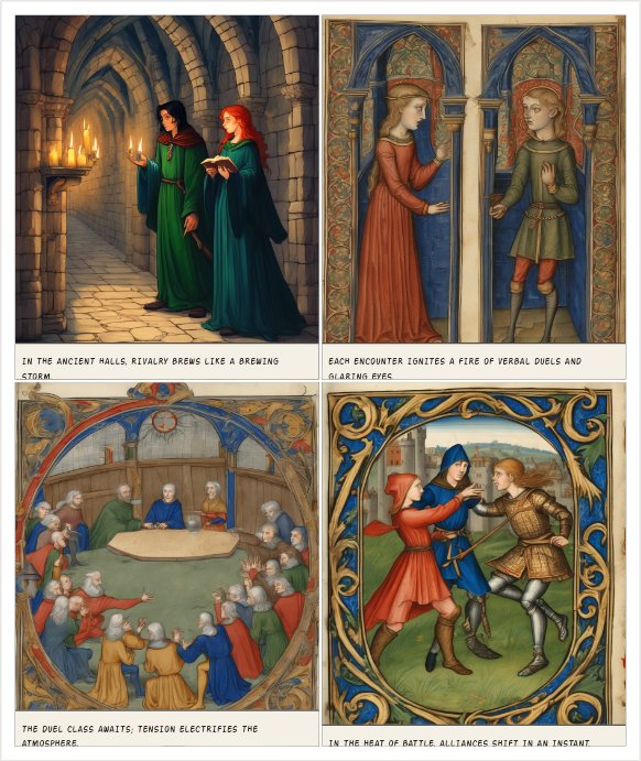 Panel 1: A corridor in the ancient school of magic, floating candles flickering, two students from rival houses exchange cold stares. Panel 2: Every encounter is filled with sharp words and tension. Panel 3: In the duel class, the teacher calls them forward to spar. Panel 4: During the duel, a spell spirals out of control, she is thrown aside—yet her enemy steps forward, raising a shield to protect her.