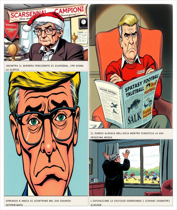 Crea un fumetto di 10 vignette, la storia verte su un presidente di una squadra di fantacalcio chiamats Scarsenal. Lui è con occhiali e capelli brizzolati. Le vignette sono così:Vignetta 1: Immagine: Un uomo di mezza età, con una faccia burbera e un cappello da Babbo Natale storto, seduto a una scrivania piena di fogli e un trofeo del Fantacalcio polveroso. Dietro di lui, uno striscione con scritto "SCARSENAL - CAMPIONI (forse un giorno)". Testo: (Presidente Scarsenal, pensando con cipiglio) "